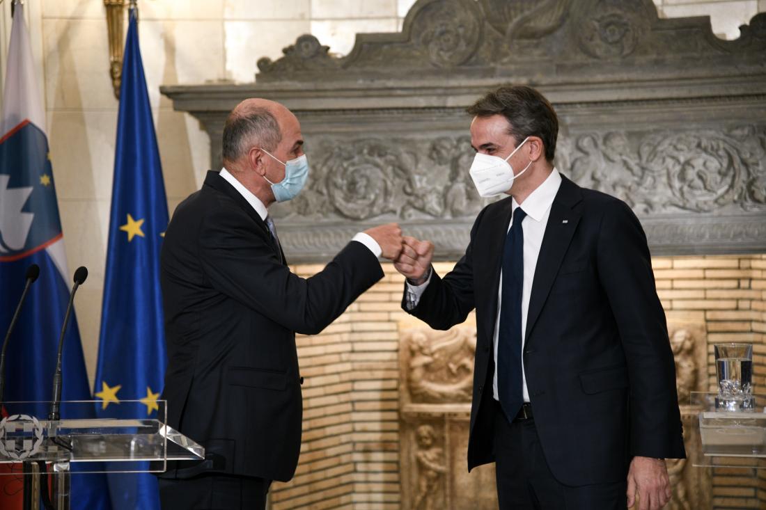 Οι χώρες μας μοιράζονται κοινές αξίες στην Ευρώπη και το ΝΑΤΟ. Το θαλάσσιο μέτωπο της Σλοβενίας μπορεί να είναι μικρό αλλά ο ρόλος του μεγάλος. Στηρίζουμε την ένταξη της Σλοβενίας στη MED7, τόνισε ο πρωθυπουργός Κυριάκος Μητσοτάκης στις κοινές δηλώσεις με τον πρωθυπουργό της Σλοβενίας, Γιάνεζ Γιάνσα (Janez Janša).