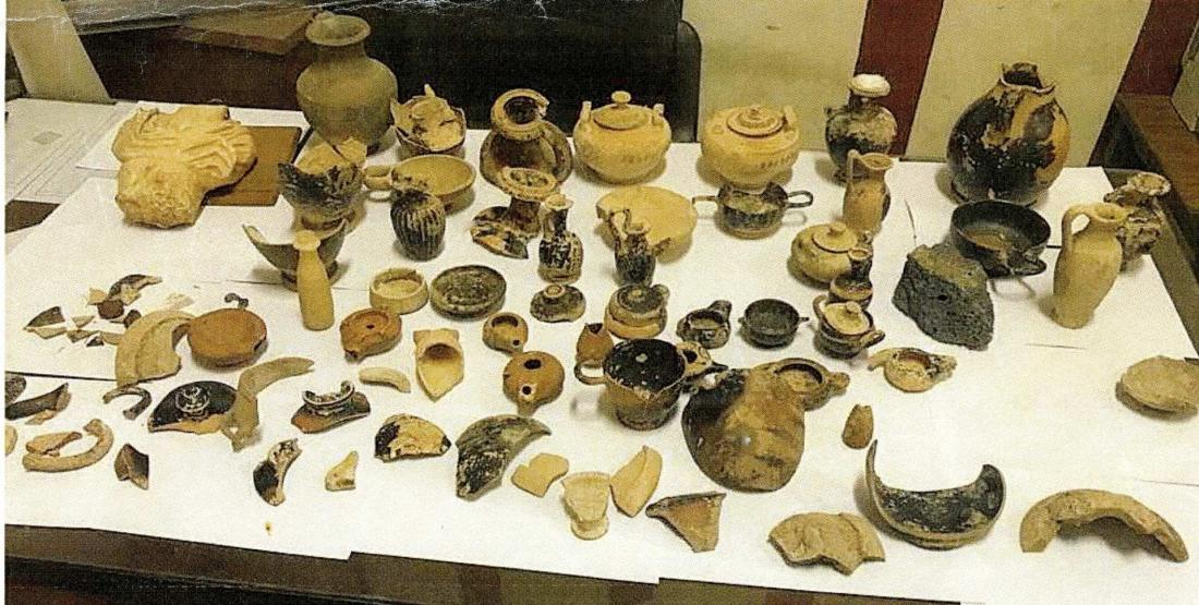 Στην κατοχή του, βρέθηκαν και κατασχέθηκαν τμήμα μαρμάρινου γλυπτού ρωμαϊκής περιόδου, τρεις λύχνοι ρωμαϊκής περιόδου, δύο μελαμβαφείς λύχνοι κλασσικής περιόδου, ερυθρόμορφη πελίκη κλασσικής περιόδου, άωτο μελαμβαφές σκυφίδιο κλασσικής περιόδου, τέσσερις οινοχόες κλασσικής περιόδου, δύο λύκηθους κλασσικής περιόδου, δύο λυκήθια κλασσικής περιόδου, θήλαστρο κλασσικής περιόδου, πινάκιο, ερυθρόμορφος αμφορέας με στρεπτές λαβές κλασσικής περιόδου, τέσσερις πυξίδες ελληνιστικής-υστεροκλασσικής περιόδου, δύο κύλικες κλασσικής περιόδου, χυτρίδιο κλασσικής περιόδου, και όστρακα και τμήματα διαφόρων αγγείων.