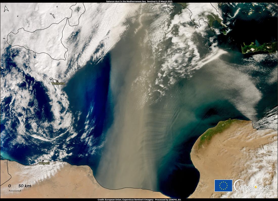 Μια φωτογραφία από το πρόγραμμα γεωσκόπησης Κοπέρνικος της Ευρωπαϊκής Ένωσης αποτυπώνει μια εντυπωσιακή συνθήκη που έχει δημιουργηθεί στην ατμόσφαιρα με ένα σύννεφο σκόνης - μήκους 800 χιλιομέτρων - από τη Σαχάρα που κατευθύνεται στη χώρα μας και στα Βαλκάνια.