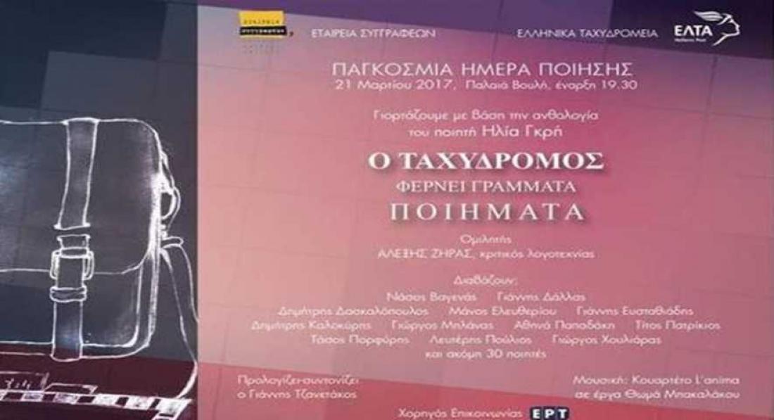 Με μία ανθολογία ποιημάτων του ποιητή Ηλία Γκρη και με τίτλο «Ο Ταχυδρόμος φέρνει γράμματα ποιήματα» τα Ελληνικά Ταχυδρομεία, γιορτάζουν την Παγκόσμια Ημέρα Ποίησης.