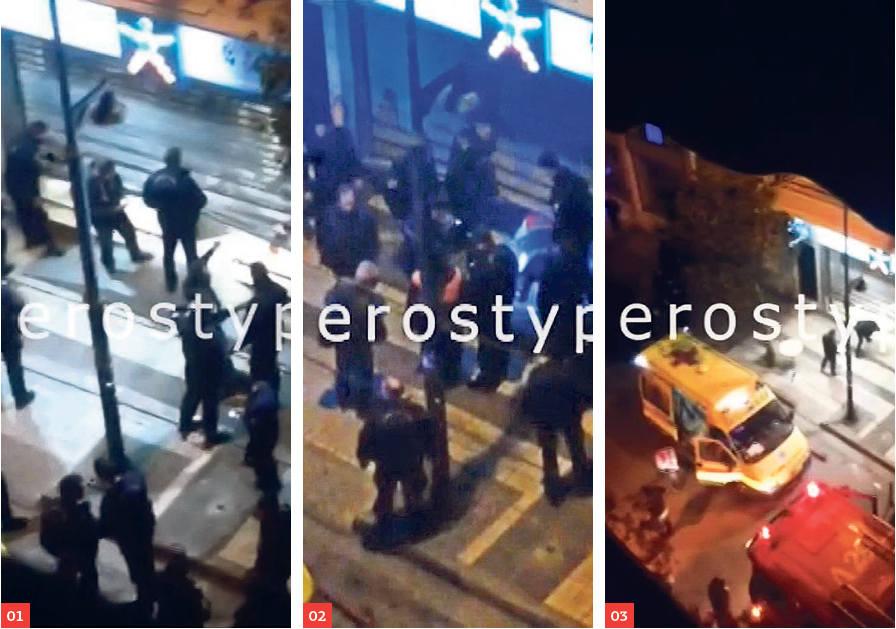 03. Τραυματιοφορείς του ΕΚΑΒ μεταφέρουν ζωντανό στο ασθενοφόρο τον 47χρονο ξενοδόχο που έχει δεχθεί τέσσερις πυροβολισμούς.