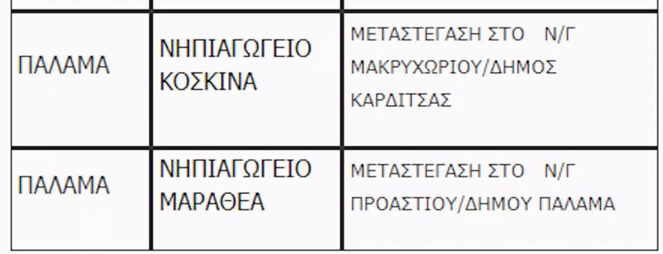 Α. Θα μεταστεγαστούν προσωρινά σε κτίρια σχολικών μονάδων στον ίδιο ή σε όμορους δήμους και σε πρωινή βάρδια (εκτός δύο περιπτώσεων όπου ρητώς αναφέρεται απογευματινή βάρδια) οι 28 σχολικές μονάδες ή τάξεις σχολικών μονάδων. Η μεταφορά των μαθητών των σχολείων αυτών έχει προβλεφθεί και θα καλυφθεί από την Περιφέρεια Θεσσαλίας.
