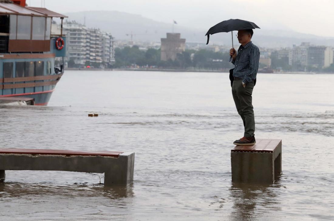 Η σφοδρή βροχόπτωση που έπληξε την πόλη δημιούργησε μία τάφρο στην είσοδο του Λευκού Πύργου, εγκλωβίζοντας τους μαθητές στο εσωτερικό του.