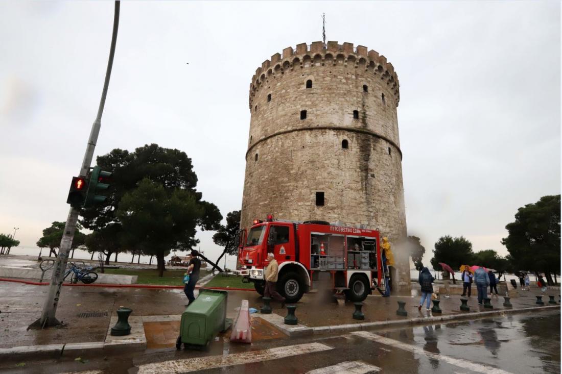 Θεσσαλονίκη: Κλειστός για εργασίες ο Λευκός Πύργος μετά τη χτεσινή νεροποντή από την οποία πλημμύρισε η είσοδος του μνημείου