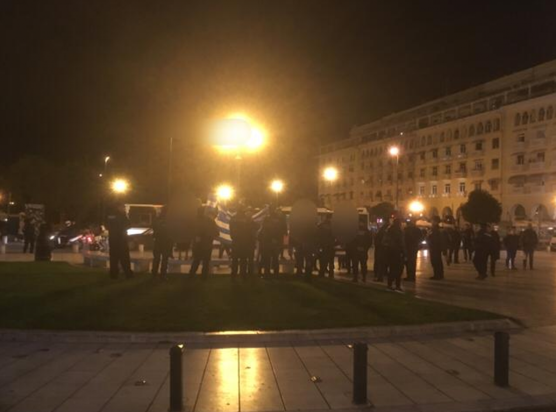 Οι διαδηλωτές είχαν συγκέντρωση διαμαρτυρίας στην πλατεία Αριστοτέλους με αφορμή την ομιλία του Τσακαλώτου στην Θεσσαλονίκη σε ανοιχτή εκδήλωση “για την οικονομία, την ακροδεξιά και την Ευρώπη” στο Ολύμπιον.