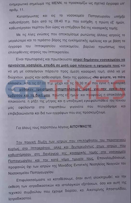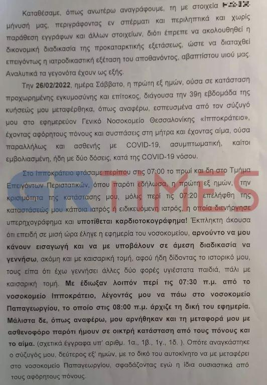«Στο νοσοκομείο Παπαγεωργίου με εισήγαγαν αρχικώς περί τις 8.40 π.μ., αντί σε γυναικολογική κλινική για να γεννήσω, σε Covid -19 κλινική στο Τμήμα Επειγόντων Περιστατικών (ΤΕΠ) και μια ώρα μετά, ήτοι στις 9.40 π.μ., της ίδιας ημέρας, με εισήγαγαν στη μαιευτική κλινική για επείγουσα, άμεση χειρουργική επέμβαση καισαρικής τομής, όπου και τελικώς μια ώρα μετά, ήτοι στις 10.30 π.μ. γέννησα με καισαρική τομή ένα άσφυγμο, άρρεν, ώριμο νεογνό υπό ισχιακή προβολή, έχοντας ήδη υποστεί εκ της εγκληματικής αρνήσεως, αλλά και της καθυστερήσεως των δύο νοσοκομείων, αποκόλληση πλακούντα και ρήξη μήτρας» συμπληρώνει η μητέρα.