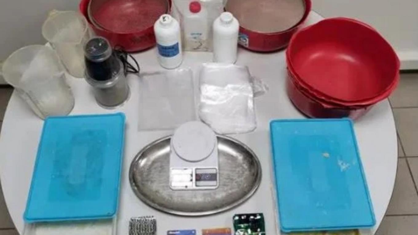 Στο αυτοσχέδιο και καλά οργανωμένο εργαστήριο, όπως επίσης σε αποθήκη (στην περιοχή της Τριανδρίας), και σε άλλους χώρους που ερευνήθηκαν εντοπίστηκαν 43 κιλά και 254 γραμμάρια συνθετικής κάνναβης σε στερεή μορφή, πάνω από 6 λίτρα συνθετικής κάνναβης σε υγρή μορφή, περίπου 2 κιλά κατεργασμένης κάνναβης σε μορφή σοκολάτας, 92,2 γραμμάρια ακατέργαστης κάνναβης και 17 ναρκωτικά δισκία. Ακόμη, κατασχέθηκαν δύο πυροβόλα όπλα - πιστόλια, ένα πιστόλι κρότου - αερίου, φυσίγγια, αβολίδοτα φυσίγγια κρότου - αερίου, τρία ηλεκτρονικά πορτοφόλια κρυπτονομισμάτων, 11 κινητά τηλέφωνα, αντικείμενα και εξοπλισμός εργαστηρίου παραγωγής συνθετικών ναρκωτικών και το χρηματικό ποσό των 126.220 ευρώ.
