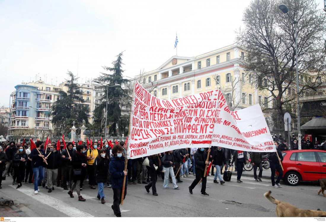 Η πορεία ξεκίνησε από το κτίριο διοίκησης του ΑΠΘ, το οποίο τελεί υπό κατάληψη και χωρίστηκε σε δύο τμήματα. Το πρώτο κινήθηκε επί της Εγνατίας και από τις οδούς Βενιζέλου, Αγίου Δημητρίου και Ιασωνίδου έφτασε στην Καμάρα και σταμάτησε μπροστά από την αστυνομική δύναμη, που είχε κλείσει με κλούβες την Εγνατία προς το πανεπιστήμια, στο ύψος του Συντριβανίου. Το δεύτερο τμήμα της πορείας κινήθηκε στην οδό Εθνικής Αμύνης και από τις οδούς Τσιμισκή και Ίωνος Δραγούμη επέστρεψε στην Εγνατία και ενώθηκε με το πρώτο κομμάτι της πορείας στο ύψος της Καμάρας.