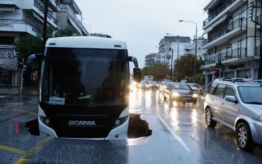 Λαχτάρισαν το πρωί οι επιβάτες λεωφορείου, όταν από την ισχυρή βροχόπτωση που πλήττει τη Θεσσαλονίκη υποχώρησε τμήμα οδοστρώματος επί της οδού Εθνικής Αντιστάσεως στην Καλαμαριά, με συνέπεια το μπροστινό μέρος του οχήματος να πέσει μέσα σε γούβα.