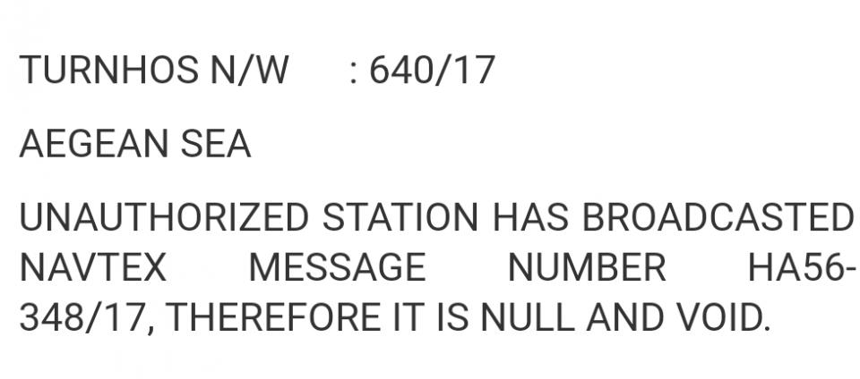 Η Υδρογραφική Υπηρεσία του τουρκικού ναυτικού εξέδωσε την NAVTEX 638/17 με την οποία δηλώνει ότι η ελληνική NAVTEX 346/17, η οποία εκδόθηκε από την Υδρογραφική του ΠΝ και αφορά στην παράνομη δέσμευση 3 περιοχών στο Αιγαίο για σχεδόν όλο το 2017 με τις τουρκικές NAVTEX 821-822-823/16, εκδόθηκε από αναρμόδιο σταθμό (εννοεί τους ελληνικούς σταθμούς που είναι οι μοναδικοί εγκεκριμένοι από τον ΙΜΟ) και ως εκ τούτου είναι άκυρη!!!