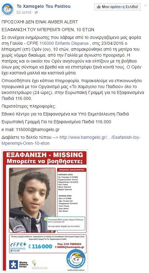 Το χαμόγελο του παιδιού ενημερώθηκε από τον συνεργαζόμενο φορέα στην Γαλλία «CFPE - Enfants Disparus» ότι στις 23/04/2016 o Ορέν Μπερεμπί, 10 ετών, απομακρύνθηκε από την μητέρα του χωρίς νόμιμο δικαίωμα με άγνωστο προορισμό .