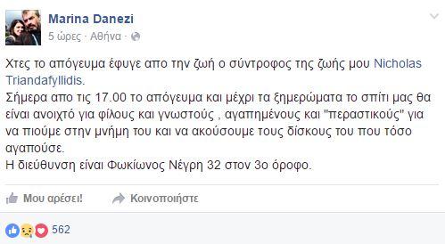 Η νυν σύντροφός του Μαρίνα Δανέζη τον αποχαιρέτησε με ένα πολύ συγκινητικό ποστ στον προσωπικό της λογαριασμό στο Facebook.