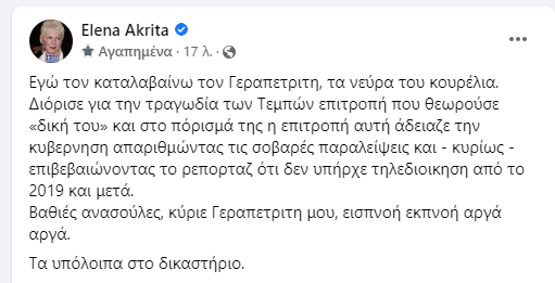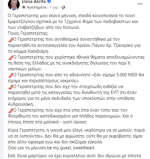 Με δυο αναρτήσεις στην σελίδα της στο Facebook απάντησε πριν λίγο η Ελενα Ακρίτα στην μήνυση που κατέθεσε εναντίον της ο υπουργός Επικρατείας Γιώργος Γεραπετρίτης. Γράφει συγκεκριμένα: