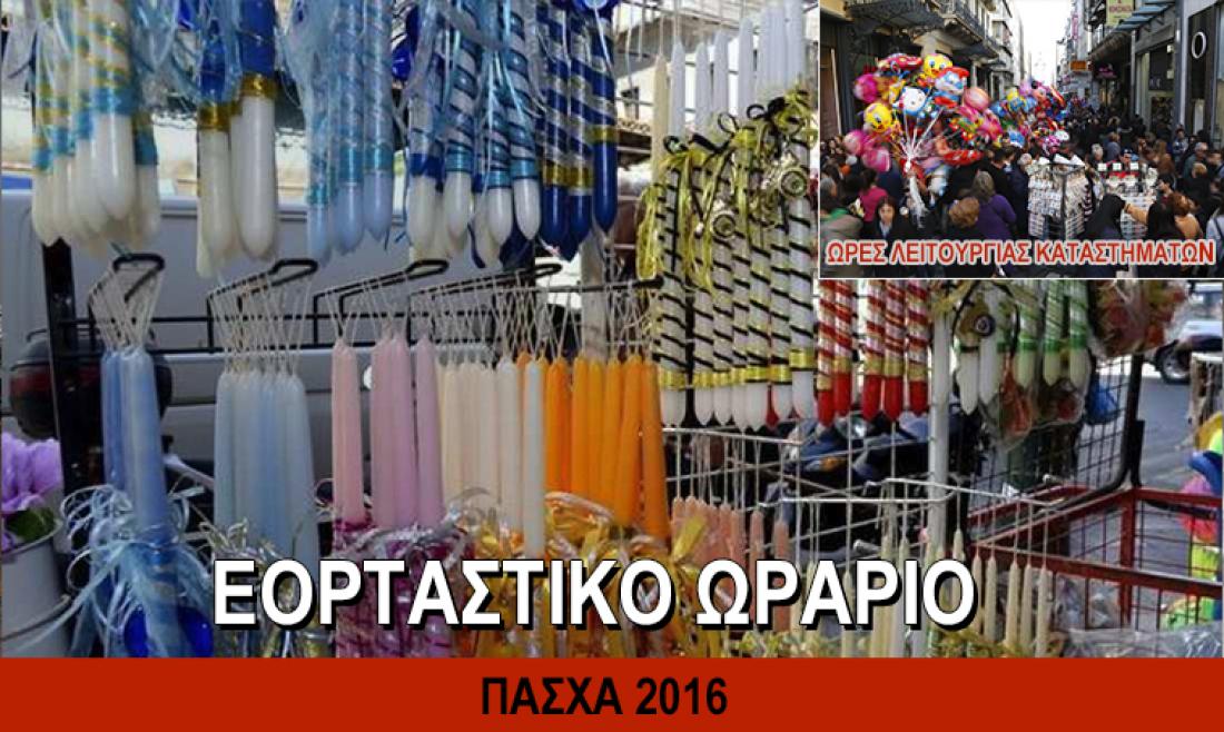 Ο Σύνδεσμος Επιχειρήσεων & Λιανικής Πώλησης Ελλάδος ανακοίνωσε το ωράριο λειτουργίας των εμπορικών καταστημάτων των επιχειρήσεων –μελών του για τη περίοδο των εορτών Πάσχα 2016 για όλη την επικράτεια.