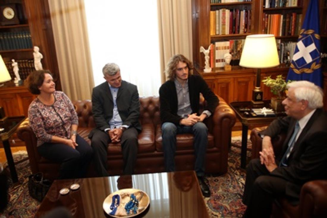 Ο Πρόεδρος της Δημοκρατίας, υποδέχθηκε με ζεστά λόγια τον Στέφανο Τσιτσιπά και τους γονείς του, Απόστολο και Τζούλια. «Στέφανε σε καλωσορίζω ως έναν κορυφαίο εκπρόσωπο της γενιάς σου και ως ένα πραγματικό πρότυπο αριστείας», του είπε μεταξύ άλλων ο κ. Παυλόπουλος, ο οποίος αναφέρθηκε ακόμη, στις προσπάθειες που κάνουν οι γονείς του για να τον στηρίξουν σε αυτό τον μοναχικό δρόμο που χαράζει και του ευχήθηκε «Καλή δύναμη και πάντα ψηλά».