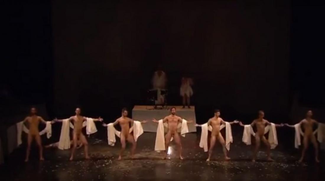 Με χλαμύδες τις οποίες σταδιακά βγάζουν, άνδρες χορευτές εμφανίζονται στη σκηνή... ολόγυμνοι, να χορεύουν όπως τους γέννησε η μάνα τους ακόμη και συρτάκι υπό τους ήχους του "Ζορμπά" του Μίκη Θεοδωράκη.