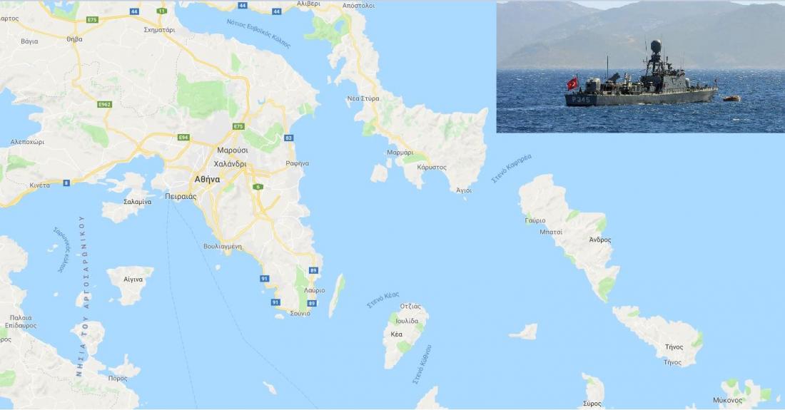 Τουρκικό πολεμικό πλοίο έφθασε μέχρι τον Καφηρεα και τώρα πλέει στο Μυρτώο Πέλαγος. Δίπλα του βρίσκεται διαρκώς η φρεγάτα ΕΛΛΗ που παρακολουθεί κάθε του κίνηση. Το τουρκικό πολεμικό συνοδεύει υποτίθεται το γεωτρύπανο που οι Τούρκοι θα χρησιμοποιήσουν για έρευνες στην Ανατολική Μεσόγειο.