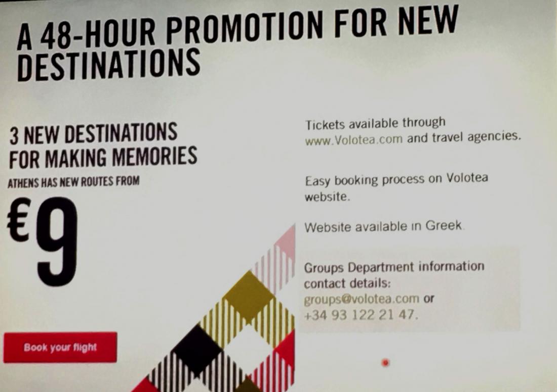 Η Volotea θα εξυπηρετεί από την Αθήνα 10 προορισμούς συνολικά: 4 εσωτερικού (Σαντορίνη, Μύκονος, Ηράκλειο και Ρόδος), 4 στην Ιταλία (Βενετία, Μπάρι, Γένοβα και Βερόνα), έναν στην Κροατία (Ντουμπρόβνικ) και έναν στη Γαλλία (Στρασβούργο).