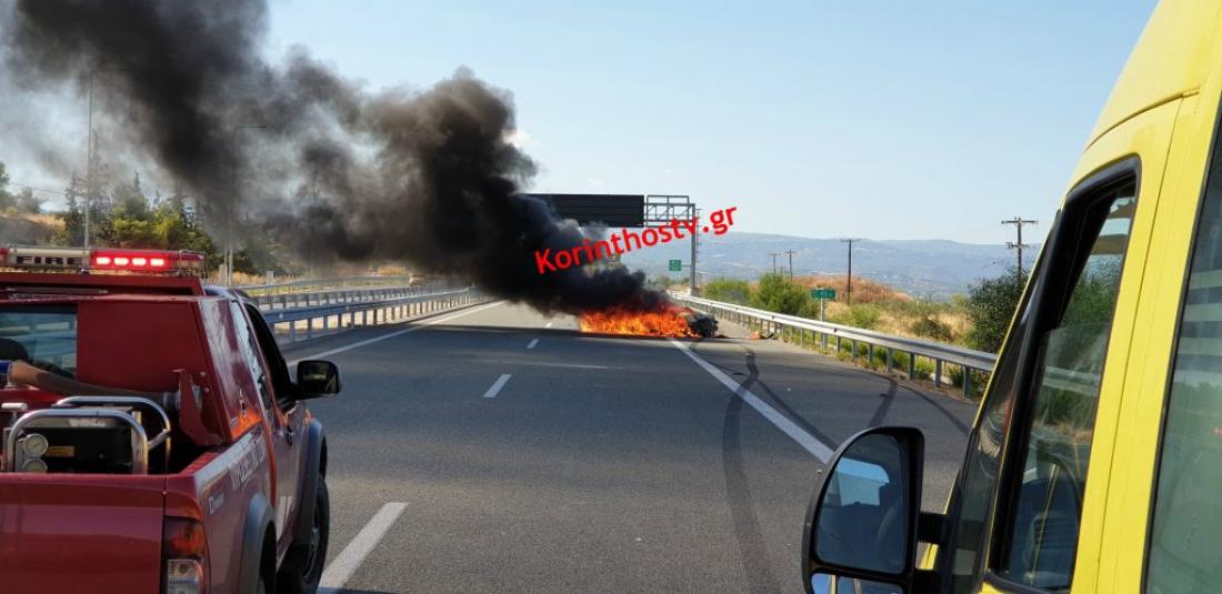Tροχαίο δυστύχημα σημειώθηκε το μεσημέρι της Δευτέρας, στο 92χλμ Κορίνθου Πατρών. Δύο Ι.Χ συγκρούστηκαν με αποτέλεσμα το ένα από τα δύο αυτοκίνητα να τυλιχτεί στις φλόγες. Ένας άνθρωπος έχασε τη ζωή του.