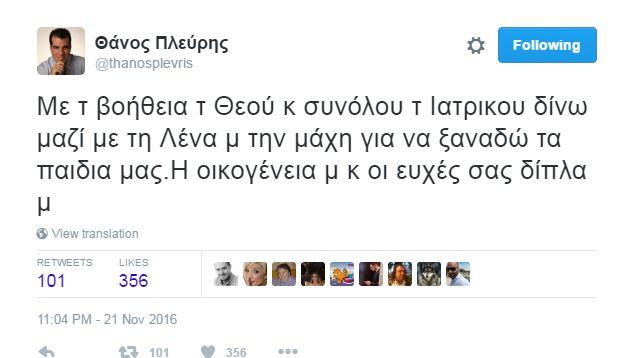 "Με τη βοήθεια του Θεού και συνόλου του Ιατρικού δίνω μαζί με τη Λένα τη μάχη για να ξαναδώ τα παιδιά μας. Η οικογένειά μου και οι ευχές σας δίπλα μου", ήταν η ανάρτηση του Θάνου Πλεύρη ο οποίος δέχτηκε πολλές ευχές για ανάρρωση.