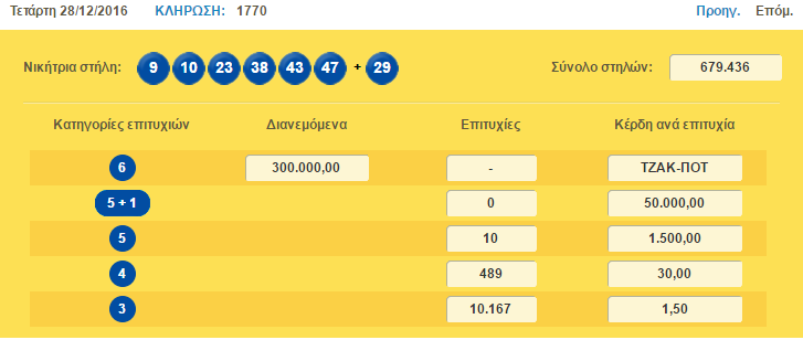 Τζακ Ποτ σημειώθηκε στη σημερινή κλήρωση της Τετάρτης 28 Δεκεμβρίου 2016.