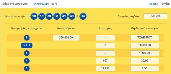 Τζακ Ποτ σημειώθηκε στην κλήρωση του ΛΟΤΤΟ του Σαββάτου 28 Ιανουαρίου 2017-Οι αριθμοί που κληρώθηκαν είναι: