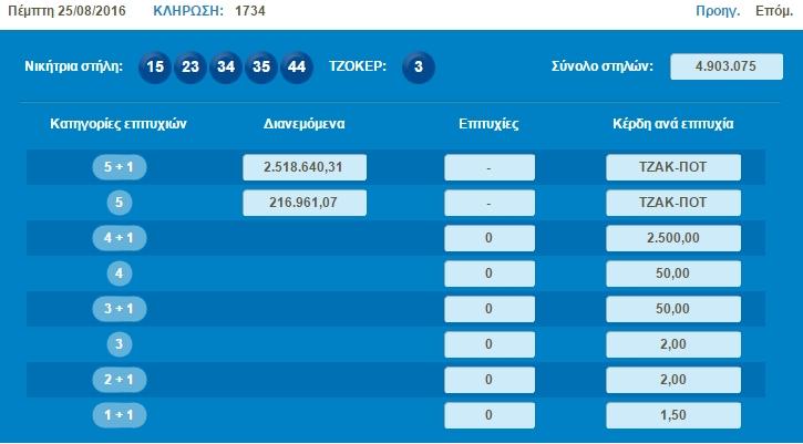 Τζακ ποτ σημειώθηκε στην κλήρωση του Τζόκερ της Πέμπτης 25/08.