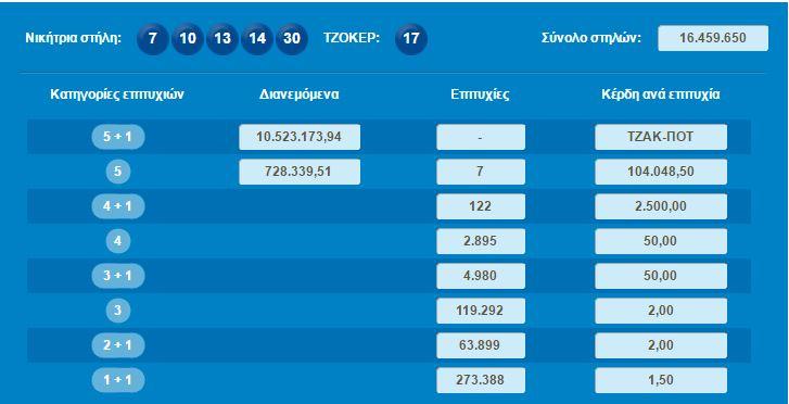 Οι τυχεροί αριθμοί είναι: 10 14 13 30 7
