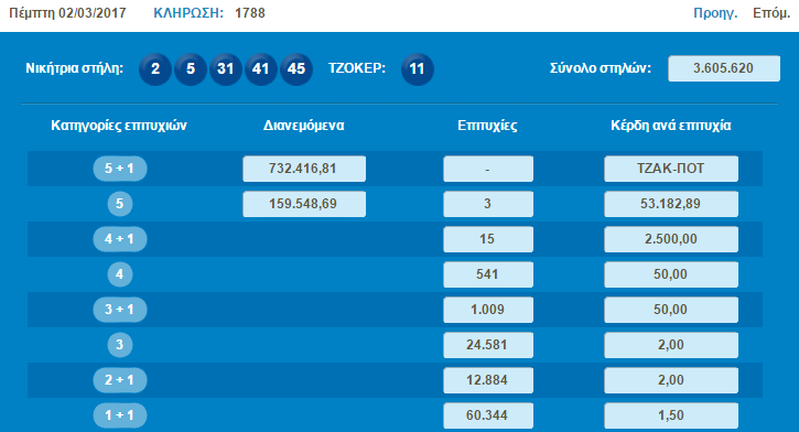 Τζακ ποτ σημειώθηκε στην κλήρωση του Τζόκερ της Πέμπτης 2/3