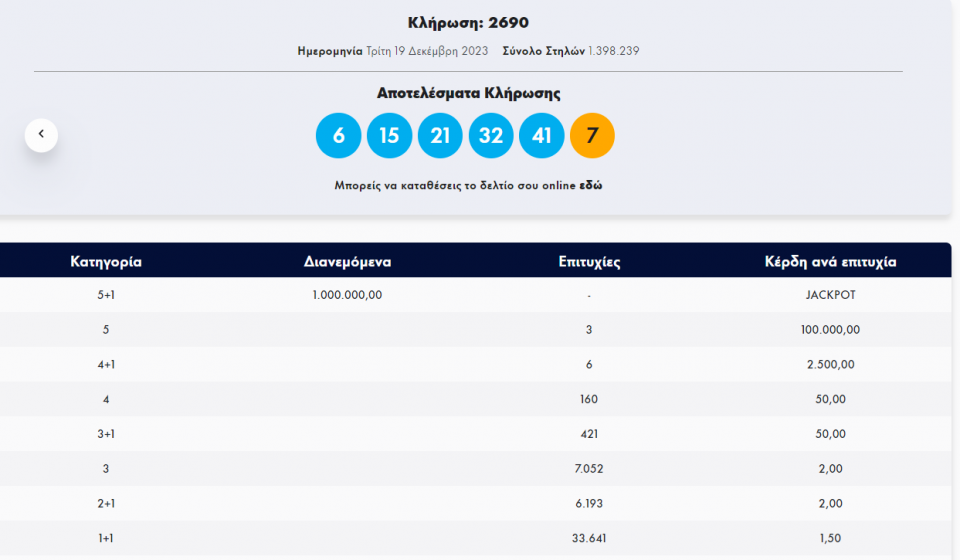 Τζόκερ: Κλήρωση 2690 - Τρίτη 19/12/2023