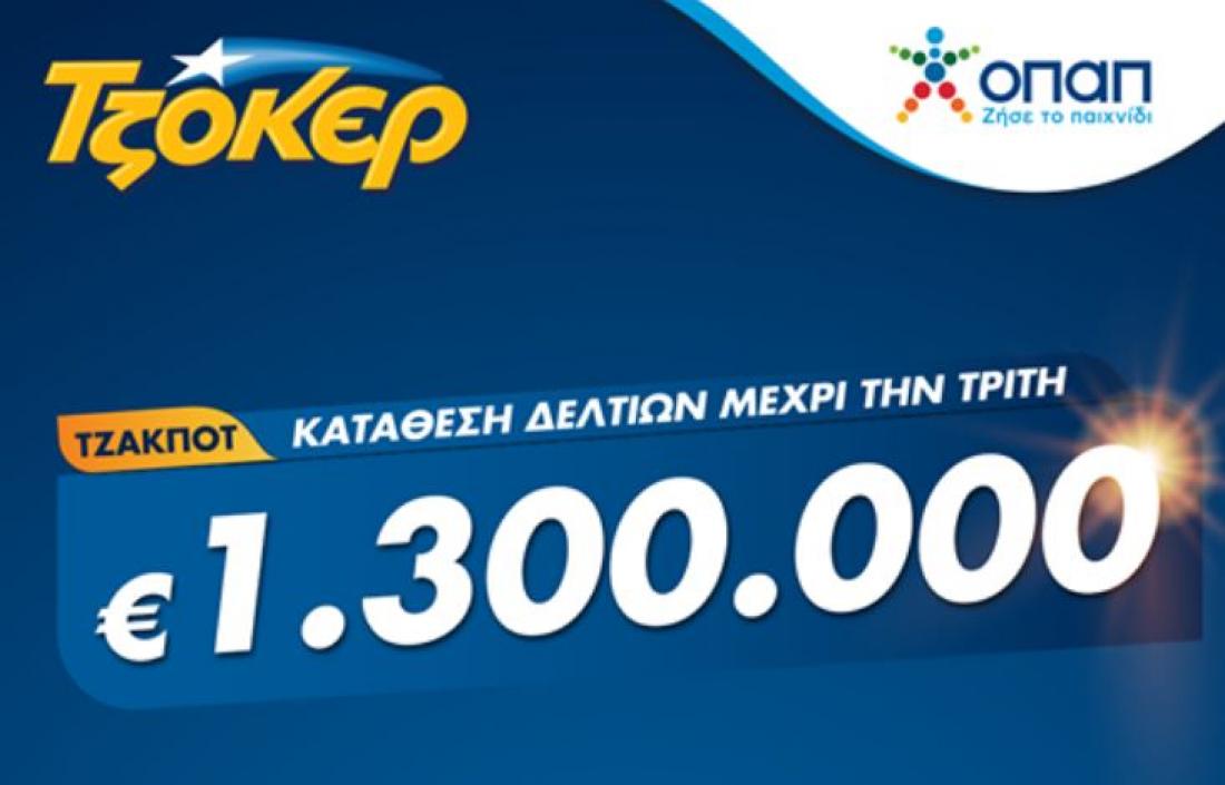 Κέρδη 1,3 εκατομμυρίων ευρώ αναμένεται να μοιράσει απόψε το τζακ ποτ του ΤΖΟΚΕΡ σε έναν ή περισσότερους νικητές της πρώτης κατηγορίας.