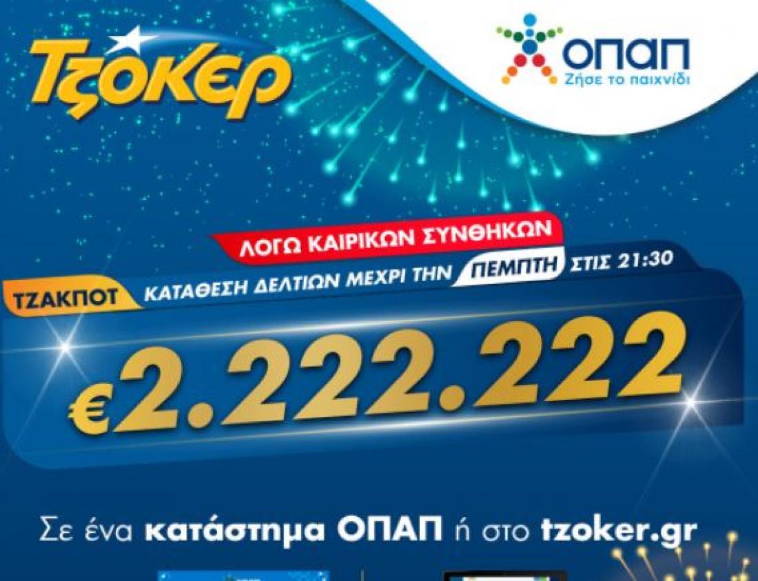 Ο αριθμός «2» πρωταγωνιστεί στην αποψινή κλήρωση του ΤΖΟΚΕΡ, η οποία αναμένεται να μοιράσει 2.222.222 ευρώ στην πρώτη κατηγορία.