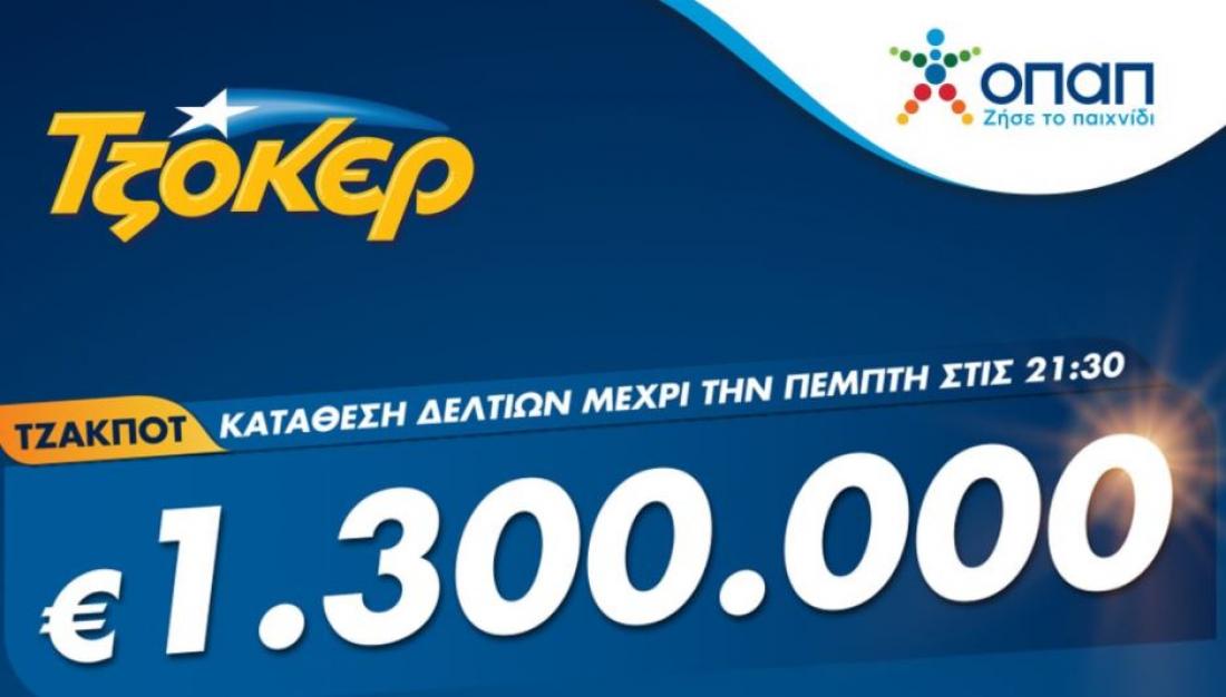 Το τέταρτο τζακ ποτ στο ΤΖΟΚΕΡ την περασμένη Τρίτη ανέβασε το διανεμόμενο ποσό της σημερινής κλήρωσης σε 1,3 εκατ. ευρώ.