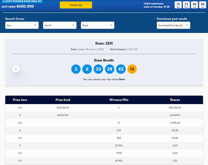 Οι πέντε τυχεροί αριθμοί από την κλήρωση 2551 ειναι: 3,6,35,38,42