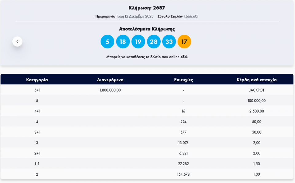 Τζόκερ : Κλήρωση 2687 - Τρίτη 12/12/2023