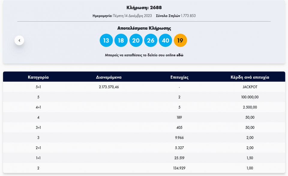 Τζόκερ: Κλήρωση 2688 - Πέμπτη 14/12/2023