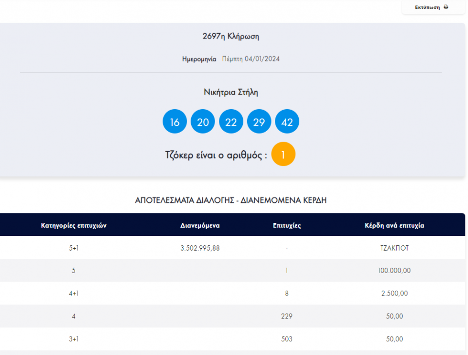 Τζόκερ: Κλήρωση 2697 - Πέμπτη 4/1/2024