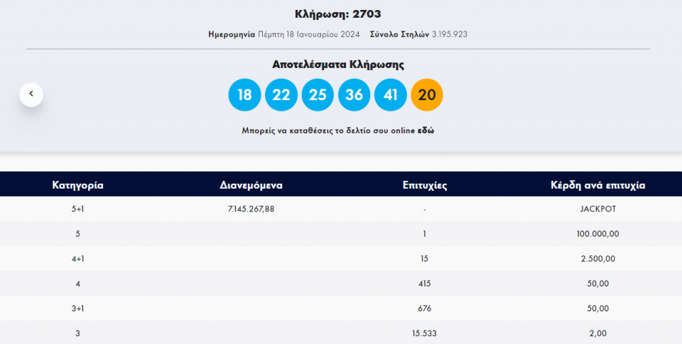 Τζόκερ: Κλήρωση 2703 - Πέμπτη 18/1/2024