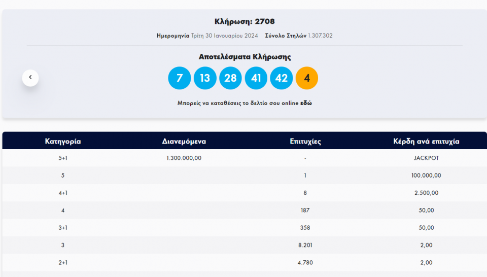 Τζόκερ: Κλήρωση 2708 - Τρίτη 30/1/2024