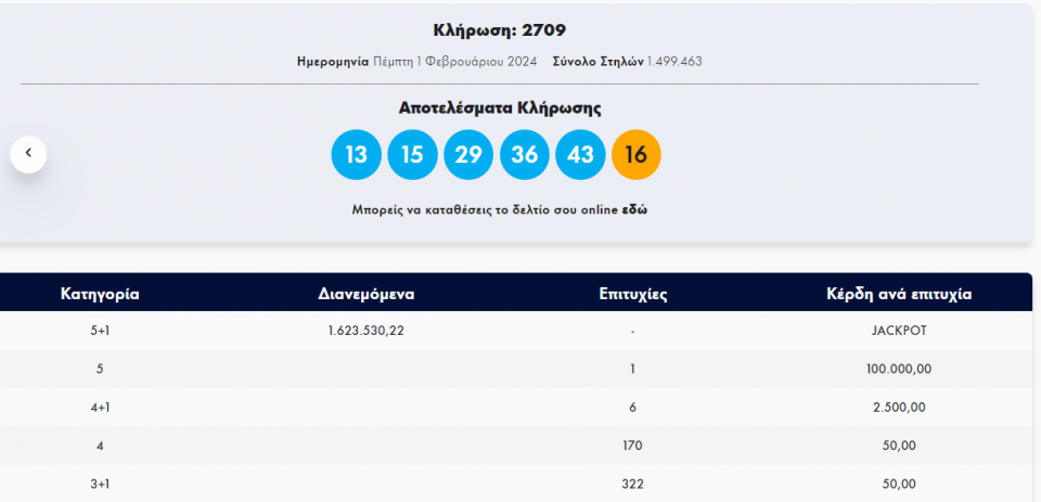 Τζόκερ: Κλήρωση 2709 - Πέμπτη 1/2/2024