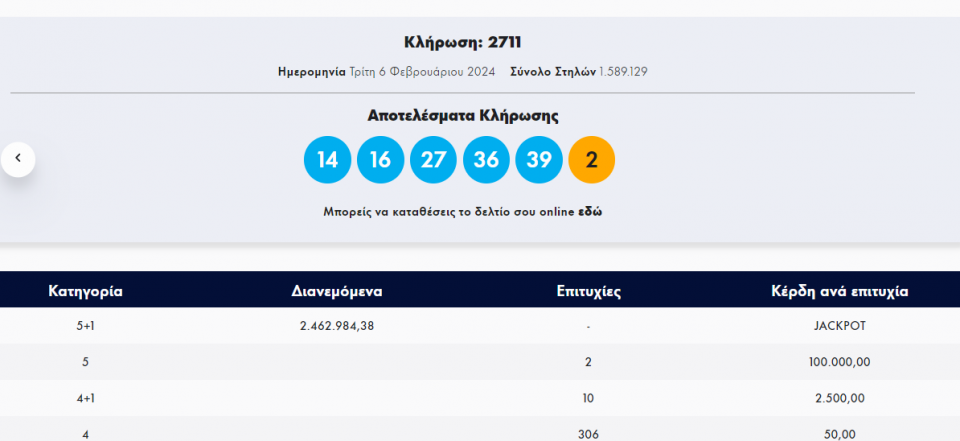 Τζόκερ : Κλήρωση 2711 - Τρίτη 6/2/2024