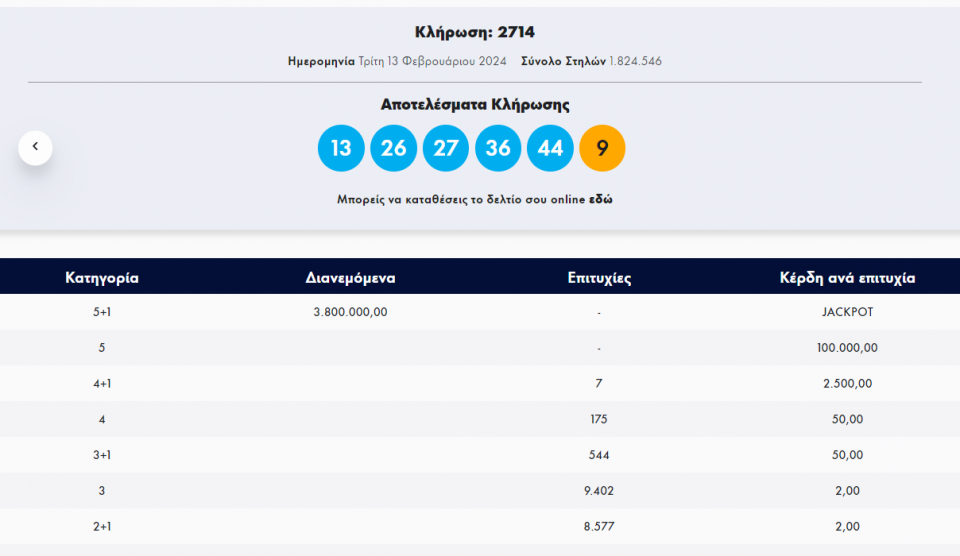 Τζόκερ: Κλήρωση 2714 - Τρίτη 13/2/2024