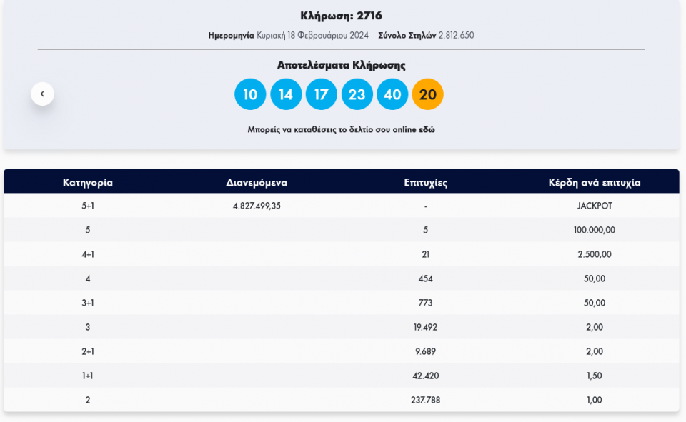 Τζόκερ: Κλήρωση 2716 - Κυριακή 18/2/2024
