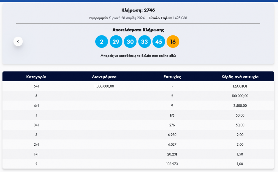 Tζόκερ: Κλήρωση 2746 - Κυριακή 28/4/2024