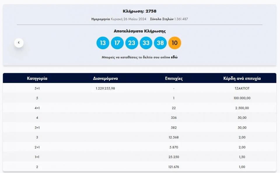 Τζόκερ: Κλήρωση 2758 - Κυριακή 26/5/2024
