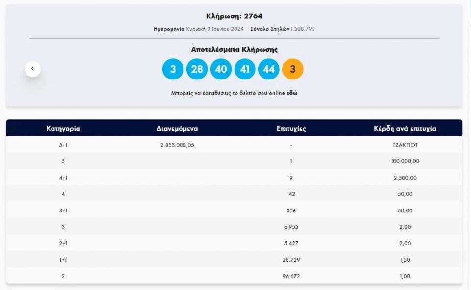 Τζόκερ : Κλήρωση 2764 - Κυριακή 9/6/2024