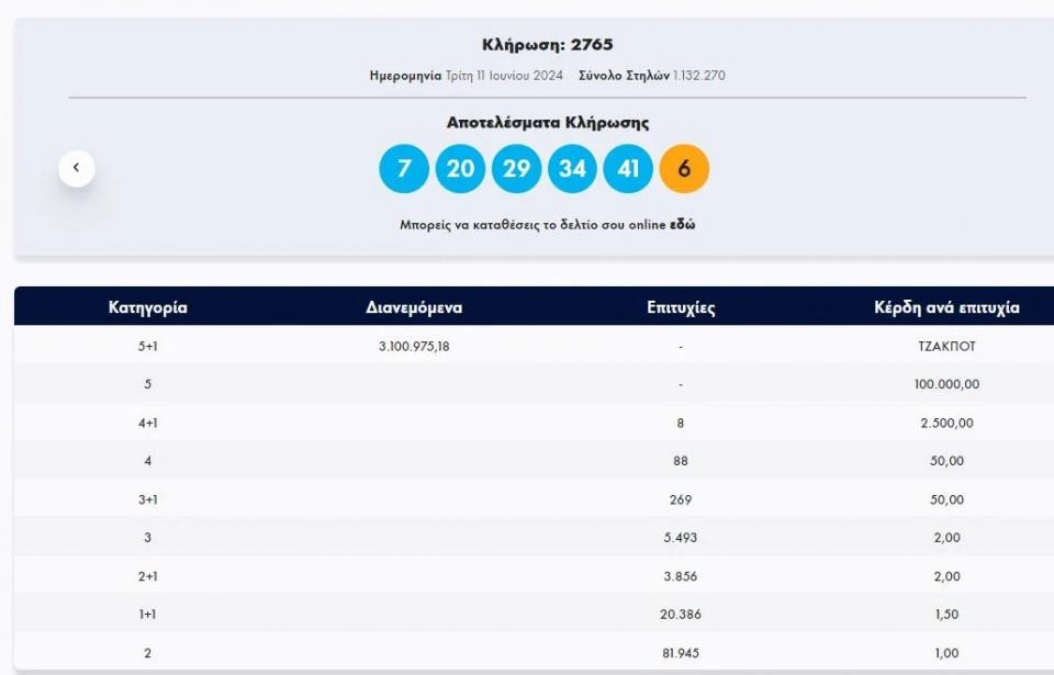 Τζόκερ: Κλήρωση 2765 - Τρίτη 11/6/2024