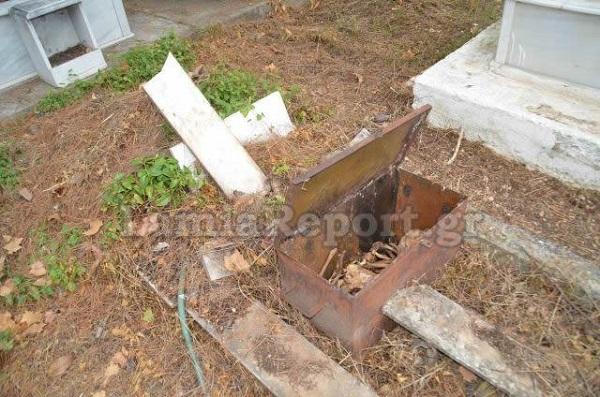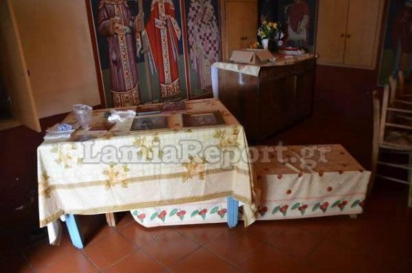 Σύμφωνα με δηλώσεις του ιερέα στο lamiareport.gr , οι άγνωστοι τοποθέτησαν κάποια αντικείμενα πάνω στην Αγία Τράπεζα και σε άλλα σημεία μέσα στο ιερό και το εκκλησάκι. Επίσης βρέθηκαν ανοιγμένες θήκες με οστά από τάφους, καθώς επίσης και άλλα αντικείμενα που είχαν πάρει από τάφους του κοιμητηρίου και τα οποία χρησιμοποιήθηκαν στην τελετή που έκαναν, μαζί με κάποιες εικόνες και άλλα υλικά που είχαν μαζί τους.
