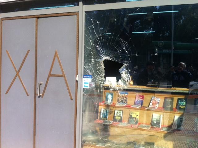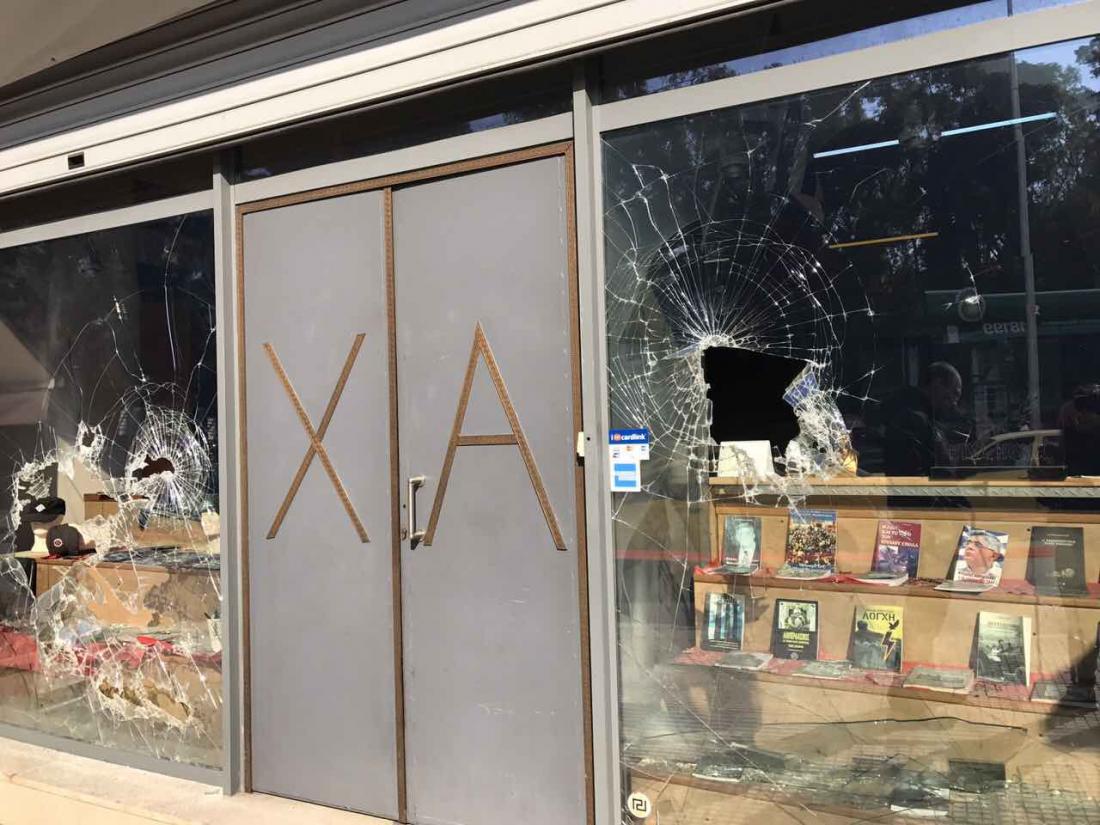 Περίπου 10 νεαροί με κουκούλες και λοστούς επιτέθηκαν στο κατάστημα που βρίσκεται στο ισόγειο των γραφείων της Χρυσής Αυγής σπάζοντας τις τζαμαρίες με βαριοπούλες και πέταξαν μπογιές μέσα στο κατάστημα, ενώ προσπάθησαν να σπάσουν και τα τζάμια των γραφείων. Σύμφωνα με τον δημοσιογράφο Τάσο Χατζή, που βρισκόταν στο σημείο, από τους κουκουλοφόρους έπεσαν και κροτίδες μικρής ισχύος που έβαλαν φωτιά σε κάδους μπροστά από τα γραφεία.