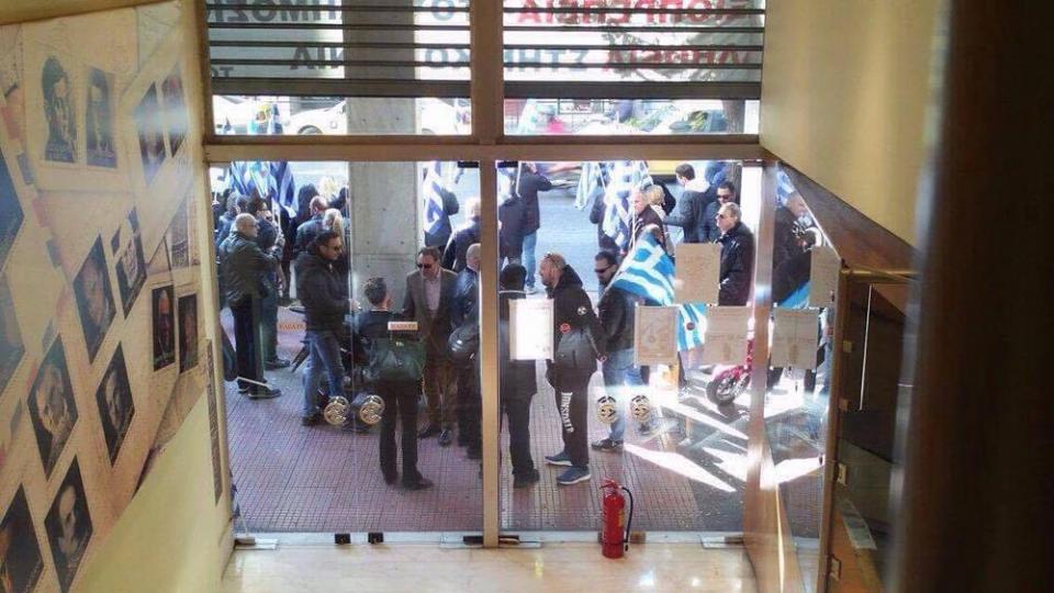 Κατά τη διάρκεια της εκδήλωσης, μέλη της Χρυσής Αυγής ντυμένοι στα συγκεντρώθηκαν επί της οδού Ακαδημίας, αποκλείοντας το κτίριο και φωνάζοντας υβριστικά συνθήματα, κρατώντας ελληνικές σημαίες.